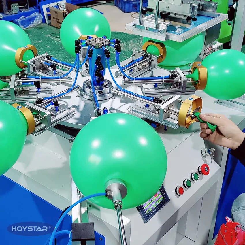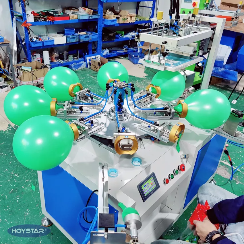 HOYSTAR Txinan fabrikatzaile eta hornitzaile fidagarria da; HOYSTAR kolore bakarreko latexezko globoak serigrafiatzeko makina hau latexezko globoetan inprimatzeko diseinatuta dago. Mahai birakaria, puzte automatikoa, biraketa automatikoa, lehortze automatikoa, deskarga automatikoko funtzioak ditu. PLC ukipen-pantailaren kontrola, interfaze atsegina funtzionamendu seguru eta intuitiborako. Makinak abiadura, zehaztasuna eta erabiltzeko erraztasuna uztartzen ditu.